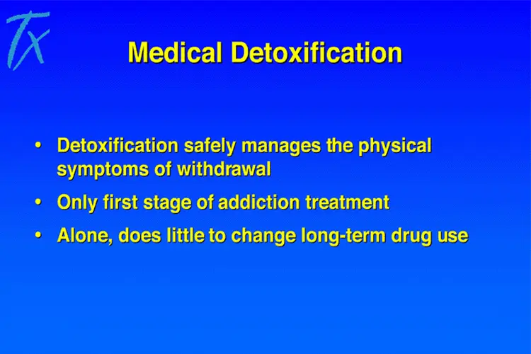 However, medical detoxification is only the first stage of addiction treatment and by itself does little to change long-term drug use. Although detoxification alone is rarely sufficient to help addicts achieve long-term abstinence, for some individuals it is a strongly indicated precursor to effective drug addiction treatment.